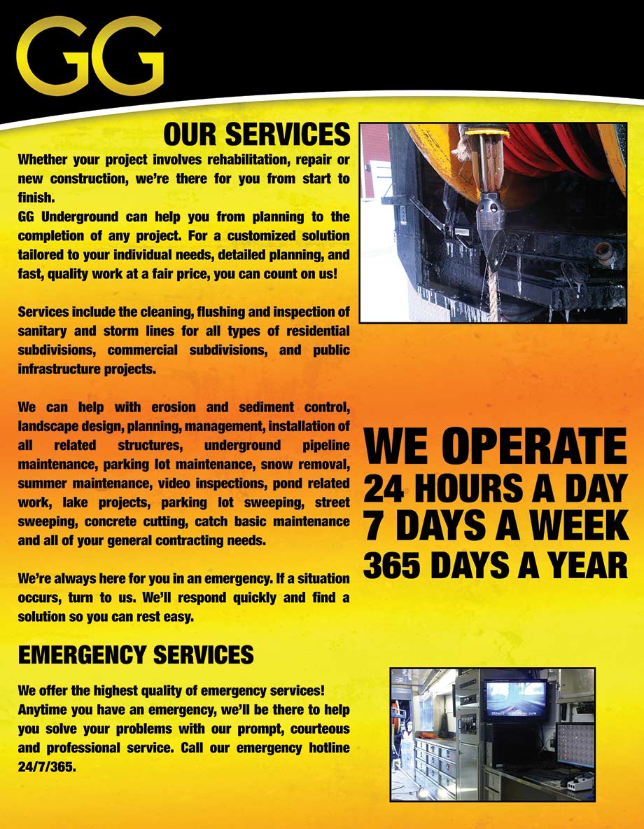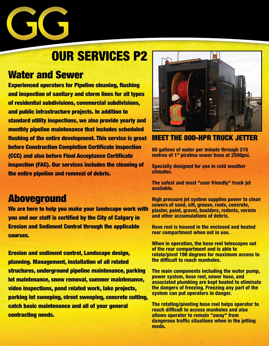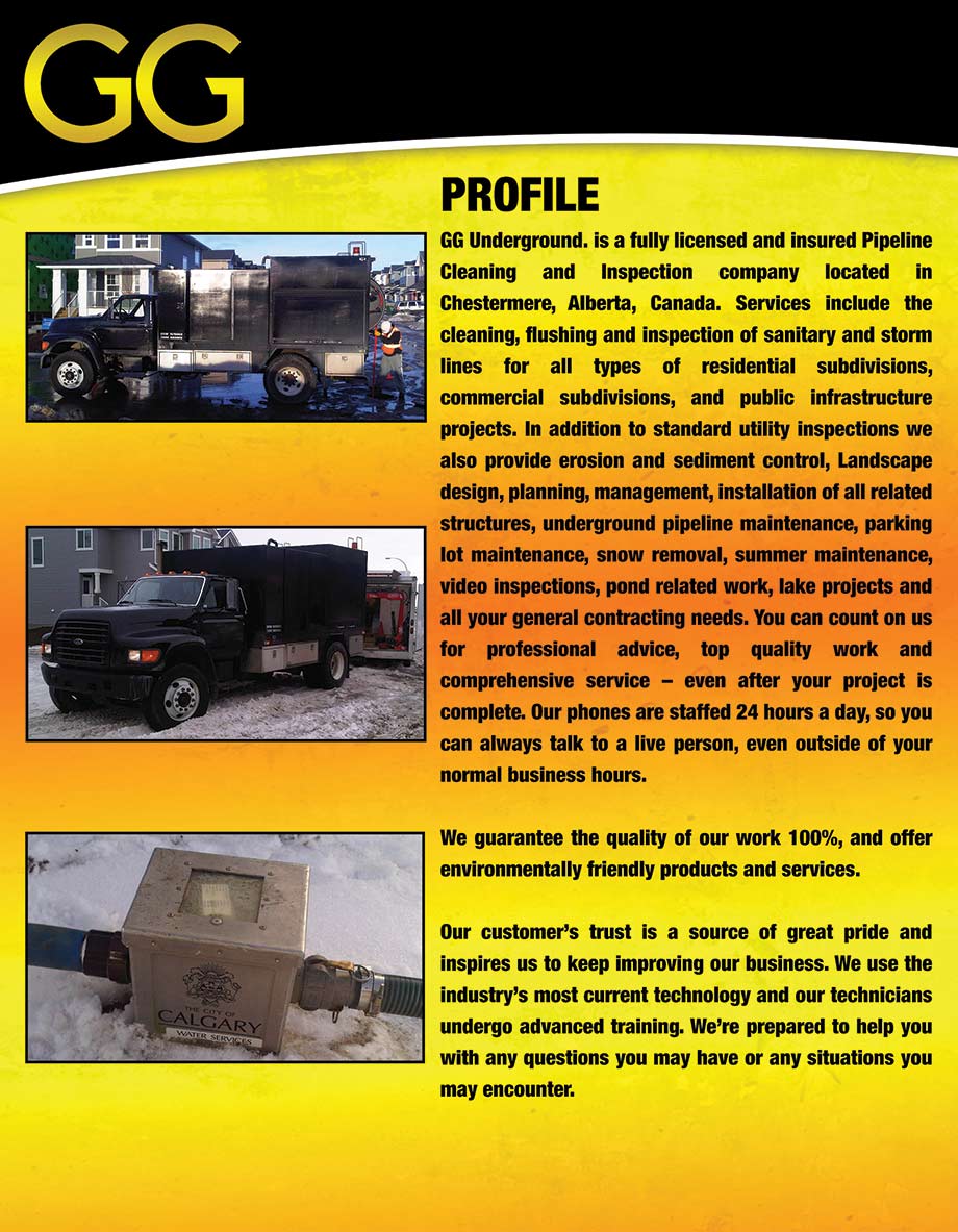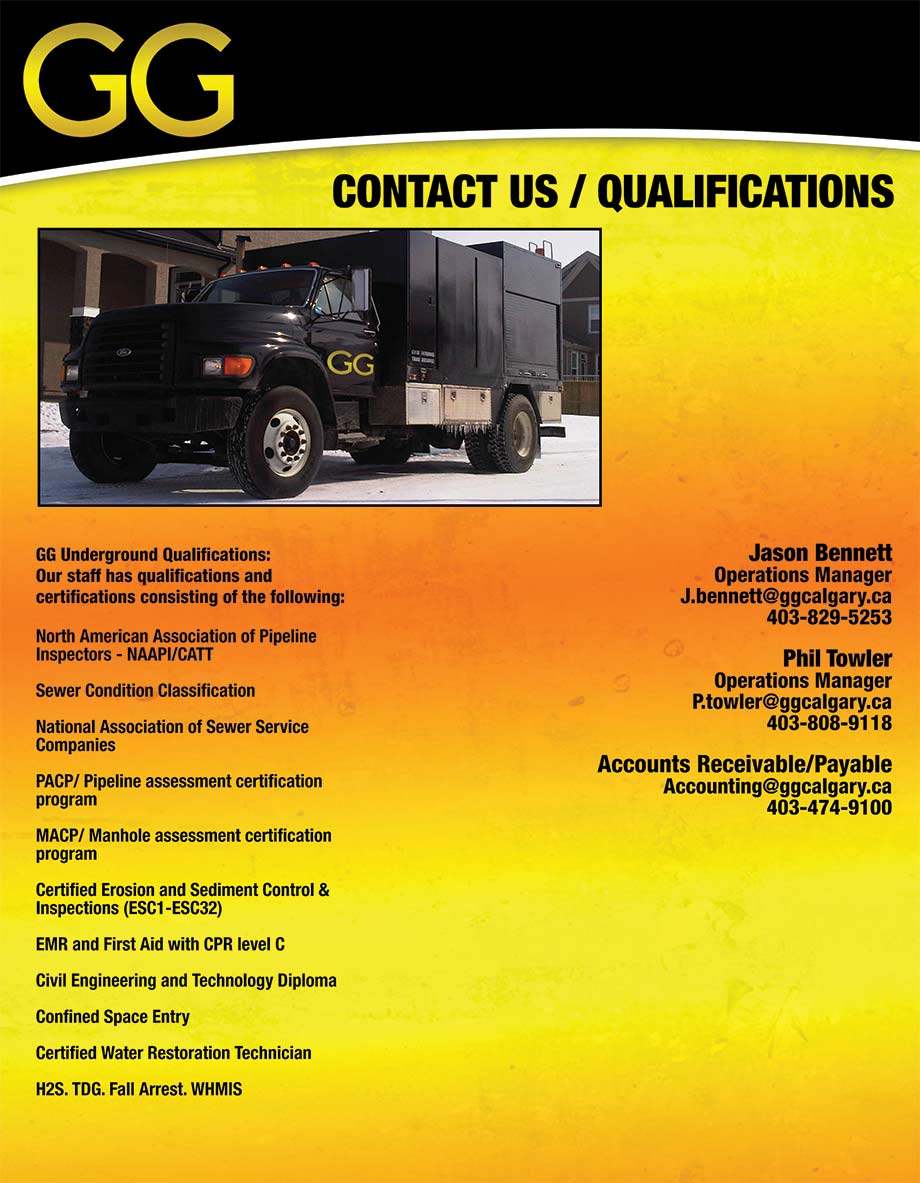 GG Underground is a fully licensed and insured Pipeline Cleaning and Inspection company located in Chestermere, Alberta, Canada. Services include the cleaning, flushing and inspection of sanitary and storm lines for all types of residential subdivisons, commercial subdivisions, and public infrastructure projects. In addition to standard utility inspections we also provide erosion and sediment control, Landscape design, planning, management, installation of all related structures, underground pipeline maintenance, parking lot maintenance, snow removal, summer maintenance, video inspections, pond related work, lake projects and all your general contracting needs. You can count on us for professional advice, top quality work and comprehensive service – even after your project is complete. Our phones are staffed 24 hours a day, so you can always talk to a live person, even outside of your normal business hours.